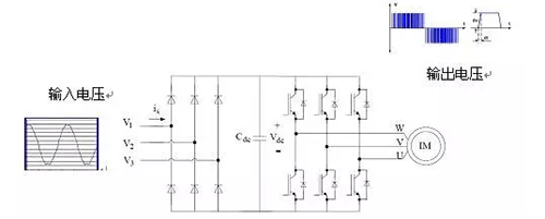 變頻器的基本構(gòu)造如圖2所示,包括整流電路與逆變電路兩部分。整流電路為普通二極管與濾波電容構(gòu)成的直流電壓輸出電路,逆變電路將直流電壓變換成脈寬調(diào)制的電壓波形(PWM電壓)。因此,變頻器驅(qū)動電機(jī)的電壓波形是脈寬變化的脈沖波形,而不是正弦波電壓波形。用脈沖電壓驅(qū)動電機(jī)就是導(dǎo)致電機(jī)容易損壞的根本原因。