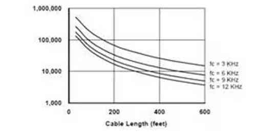 變頻器的載波頻率越高,輸出電流波形越接近正弦波,這會降低電機(jī)的運(yùn)行溫度,從而延長絕緣的壽命。但是,更高的載波頻率意味著每秒鐘產(chǎn)生的尖峰電壓數(shù)量更多,對電機(jī)的沖擊的次數(shù)更多。圖4給出了絕緣壽命隨著電纜長度與載波頻率的變化。從圖中可知,對于200英尺長的電纜,當(dāng)載波頻率從3kHz提高到12kHz(變化4倍)時,絕緣的壽命從大約8萬小時降低到2萬小時(相差4倍)。